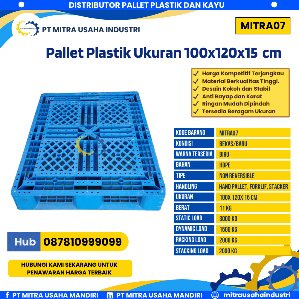 Dapatkan Pallet Plastik Bekas/Baru MITRA07 Warna Biru hanya di PT MITRA USAHA INDUSTRI — solusi tepat untuk kebutuhan logistik dan penyimpanan modern.