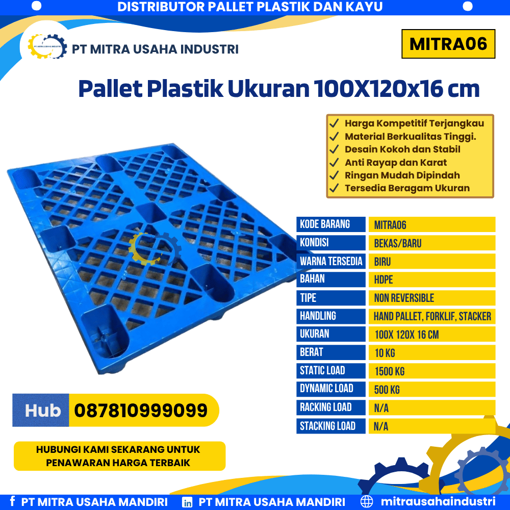 PT MITRA USAHA INDUSTRI merupakan perusahaan terpercaya yang berfokus pada penjualan pallet plastik baru dan bekas dengan kualitas unggul, pelayanan profesional, dan harga yang terjangkau. Kami hadir untuk memenuhi kebutuhan industri akan media penyimpanan dan pengangkutan barang yang kuat, higienis, serta efisien. Salah satu produk unggulan kami adalah Pallet Plastik Bekas/Baru Ukuran 100x120x16 cm Warna Biru – MITRA06, yang dirancang untuk menunjang aktivitas logistik dan pergudangan dengan performa maksimal.