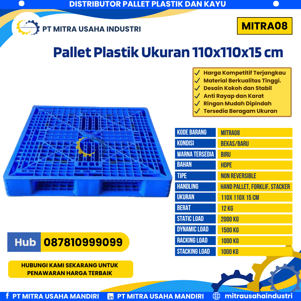 Tingkatkan efisiensi logistik dan penyimpanan barang Anda dengan Pallet Plastik Bekas/Baru Ukuran 110x110x15 cm Warna Biru – MITRA08 dari PT MITRA USAHA INDUSTRI.