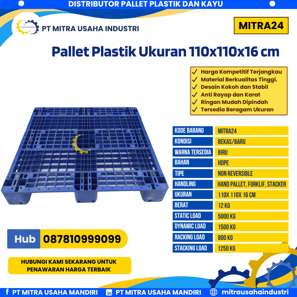 Tingkatkan efisiensi dan keamanan logistik Anda dengan Pallet Plastik Bekas/Baru Ukuran 110x110x16 cm Warna Biru – MITRA24 dari PT MITRA USAHA INDUSTRI.