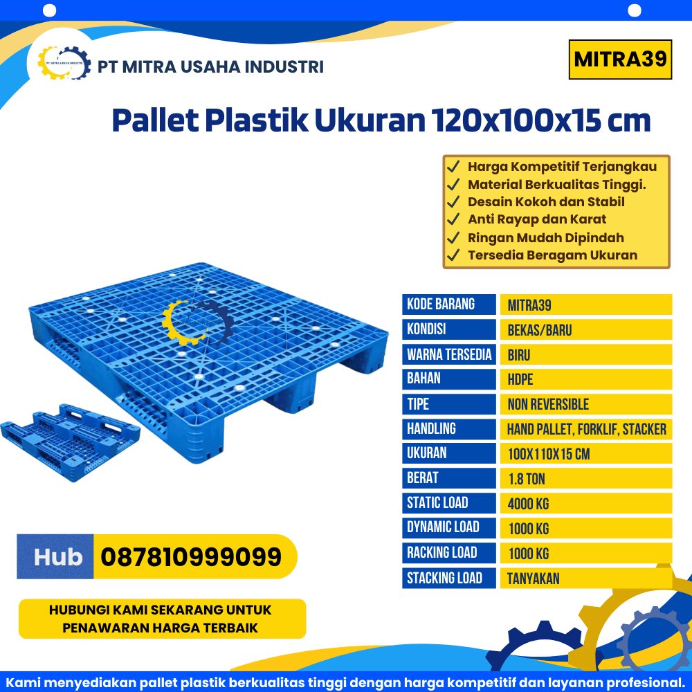 Pallet Plastik Bekas/Baru Ukuran 120x100x15 cm Warna Biru – MITRA39 merupakan solusi logistik yang efisien, kuat, dan ekonomis untuk mendukung aktivitas penyimpanan serta distribusi barang di berbagai sektor industri. Produk ini dipasarkan oleh PT Mitra Usaha Industri, perusahaan yang berpengalaman dalam penjualan pallet plastik baru dan bekas dengan standar kualitas tinggi, pelayanan profesional, serta harga yang kompetitif dan terjangkau bagi pelaku usaha di seluruh Indonesia.